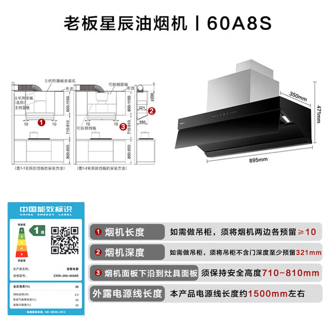 老板L1 mini小尺寸油烟机61A9S顶侧一体26m³大风压智能变频智控