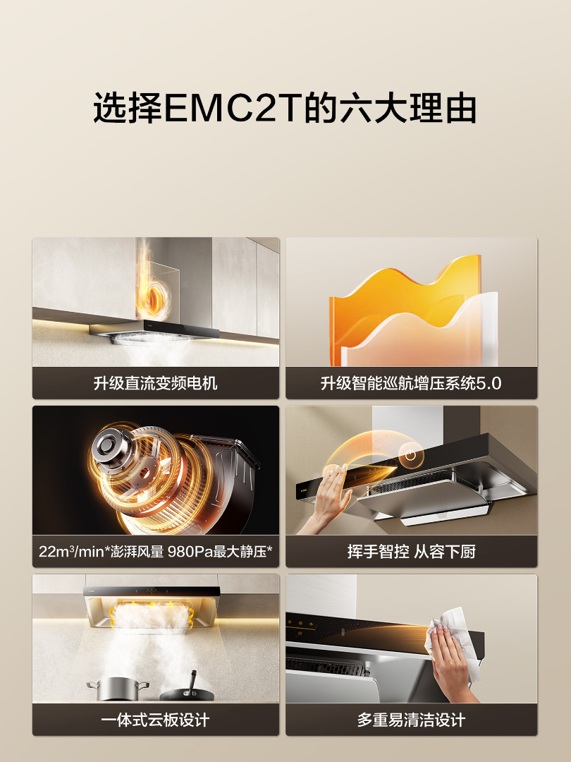方太变频油烟机EMC2T 家用欧式顶吸抽吸油烟机 厨房一级节能大吸力挥手智控易清洁 【单烟机】EMC2T 直流变频..