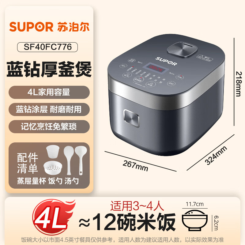 苏泊尔(SUPOR)电饭煲电饭锅5-8人大容量4升蓝钻内胆家用多功能煮饭煮粥微压智能电饭煲40FC776..