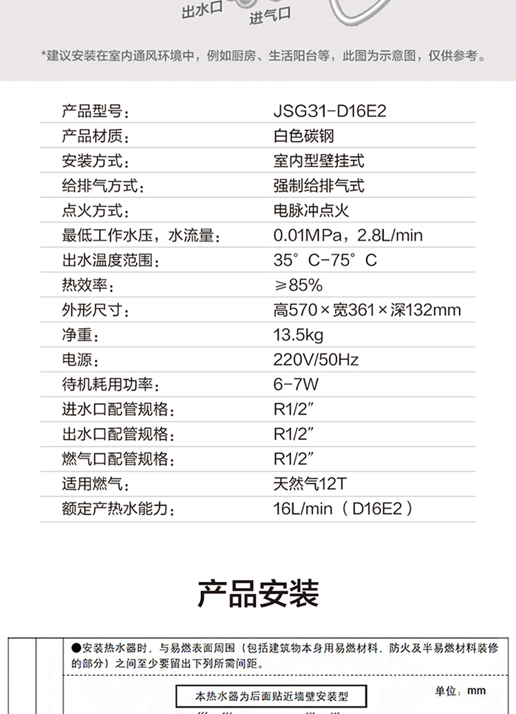 方太JSG31-D16E2(天然气12T)16升多重防护新品平衡式家用天然气燃气热水器 智能控制 安全恒温