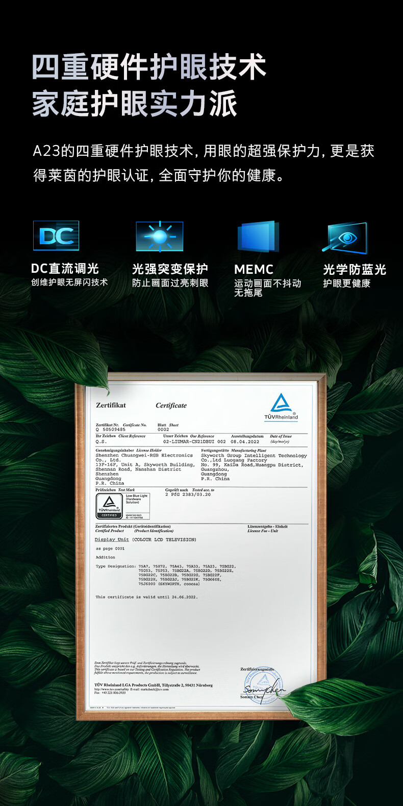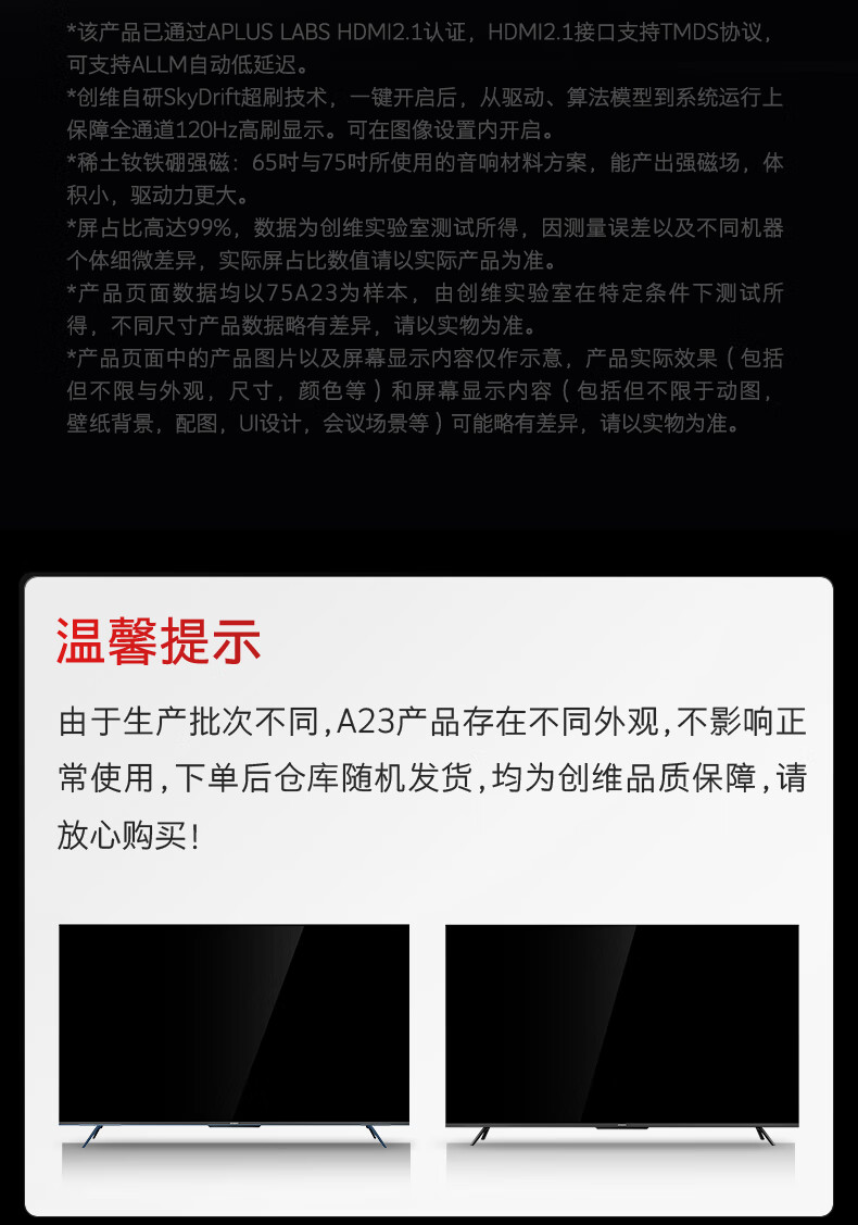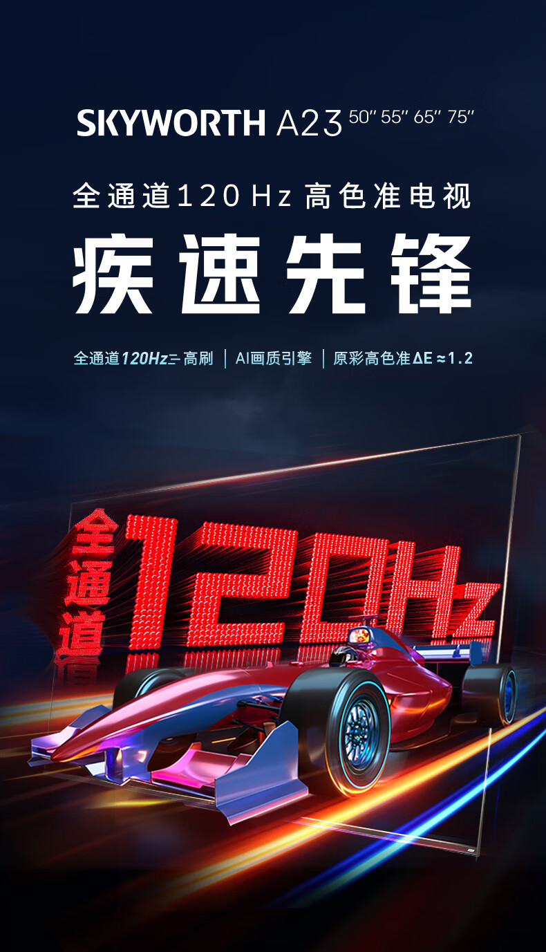 创维电视 75A23 电视机 75英寸 全通道120Hz 色准△E=1.2 3+32G 4K护眼声控全面屏