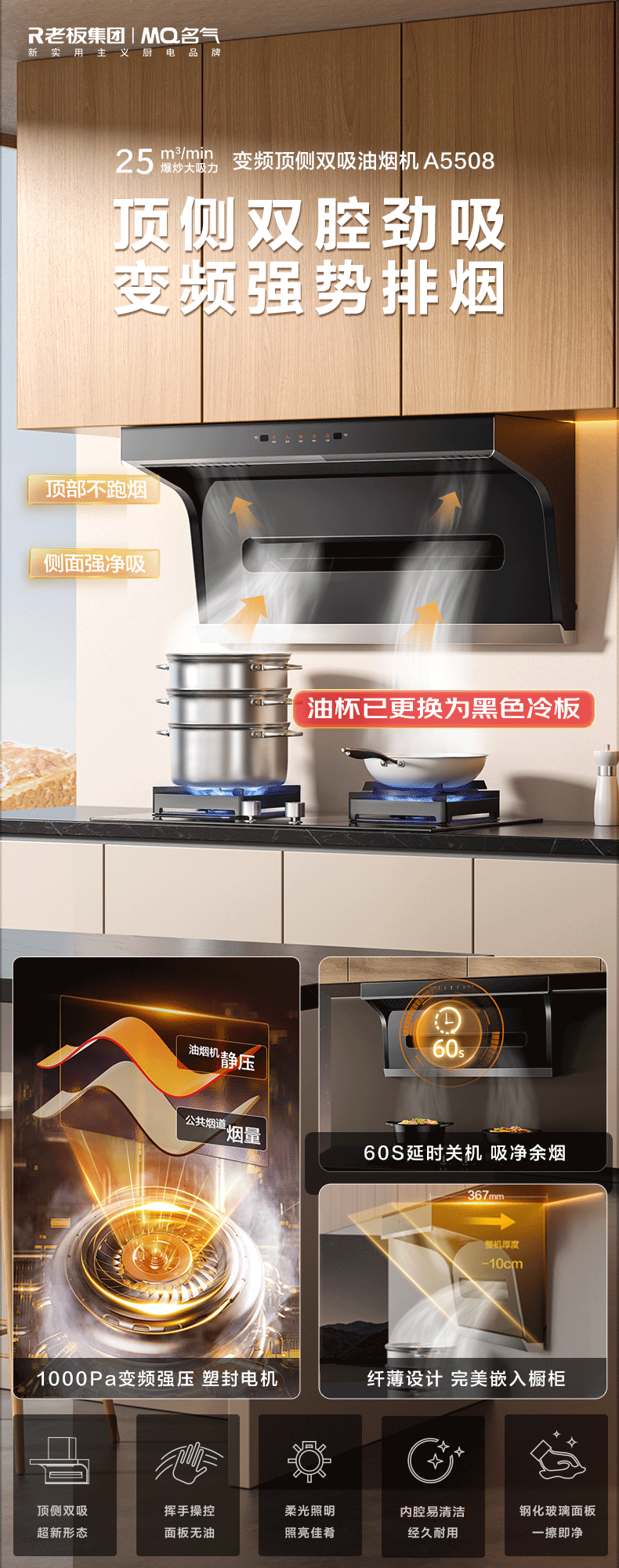 名气(MQ)小黑翼Pro A5508抽吸排烟机 25立方大吸力家用顶侧双吸吸烟机【老板出品】升级变频25立方A5508单烟机