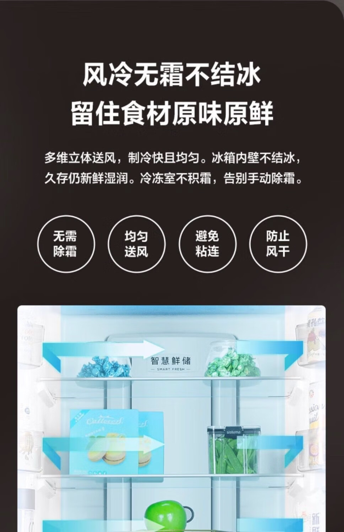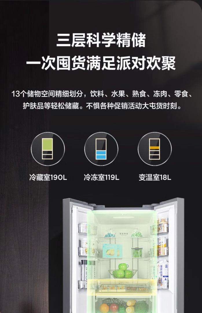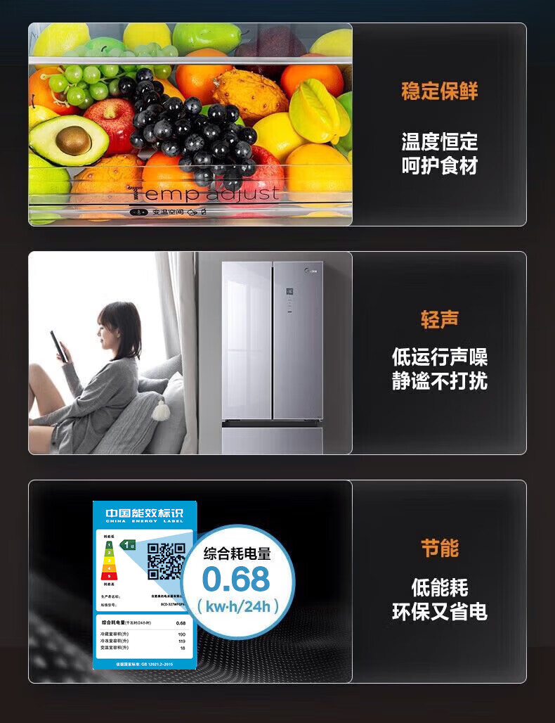 美的冰箱327升净味法式多门玻璃门双变频一级能效恒温养鲜风冷超薄BCD-327WFGPM榭湖银