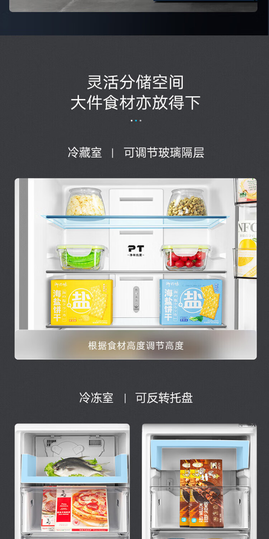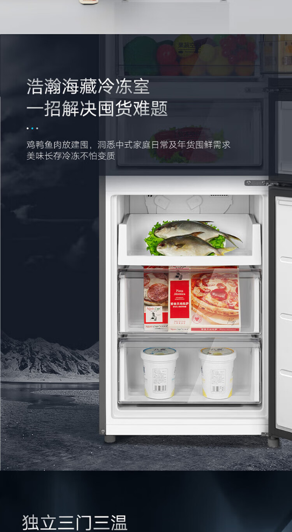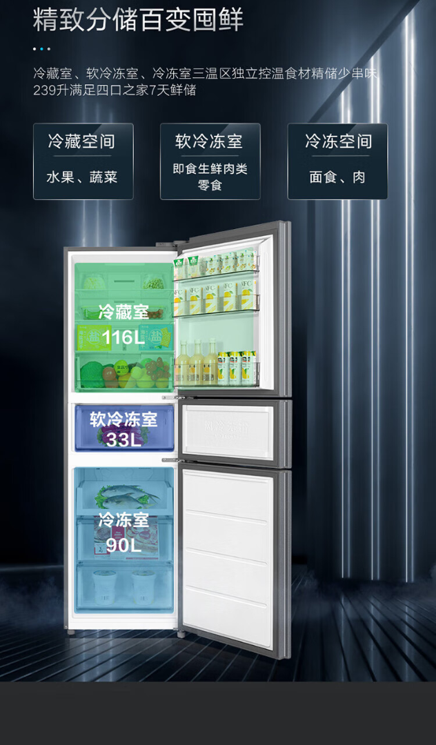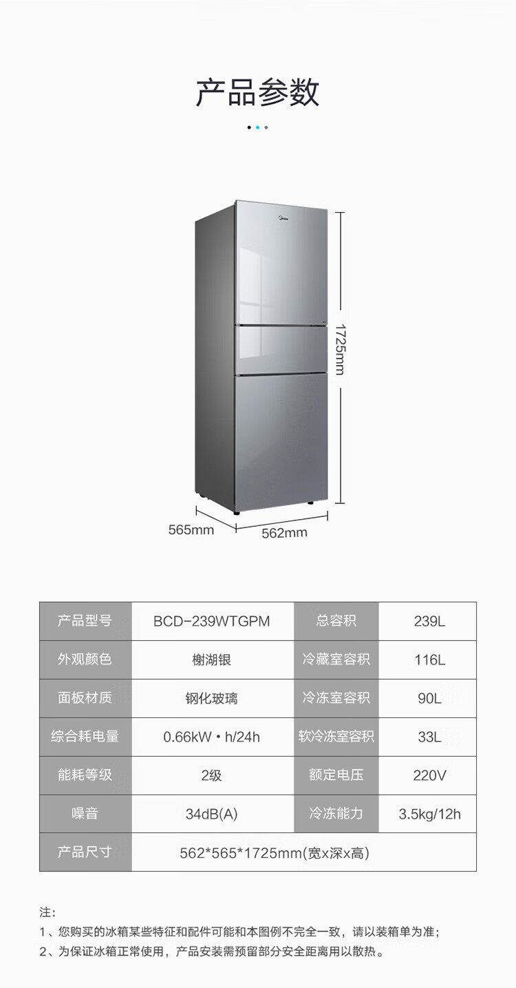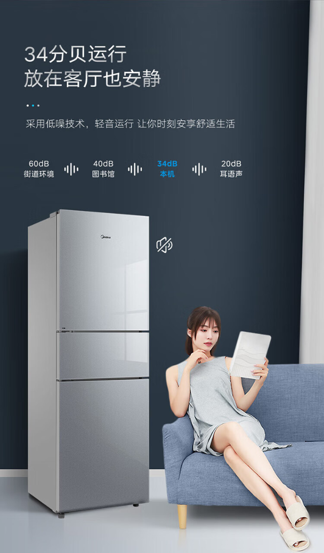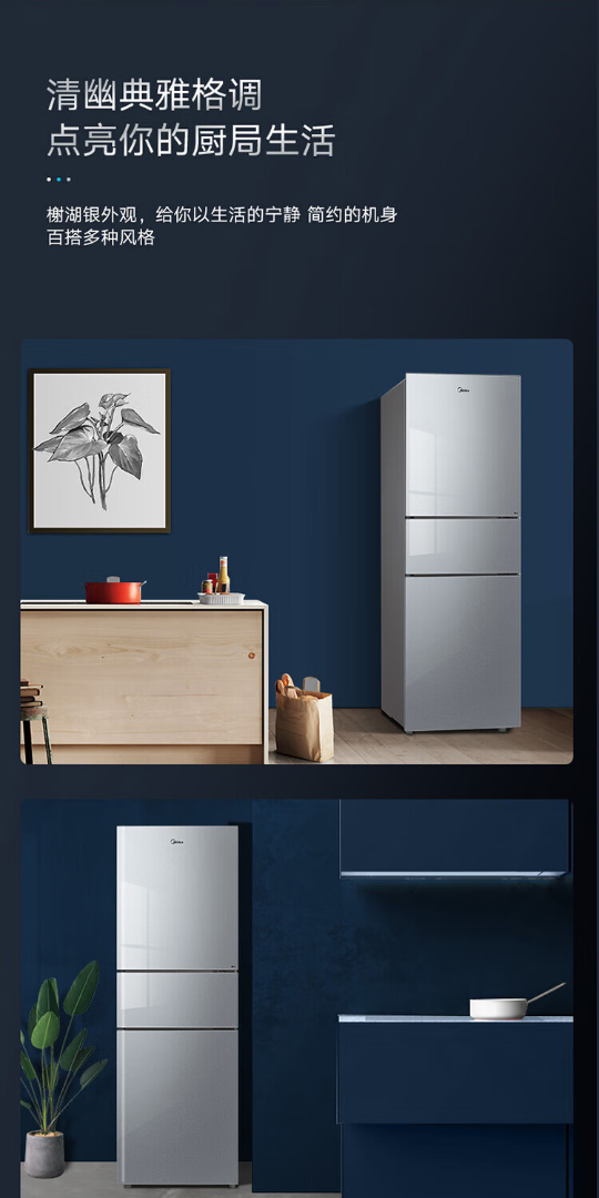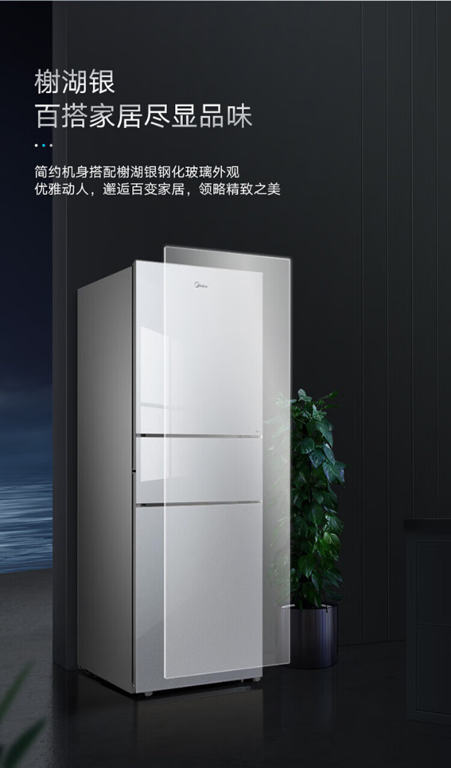 美的239升L三开门超薄家用小型宿舍租房冷藏电冰箱节能低音玻璃面板BCD-239WTGPM