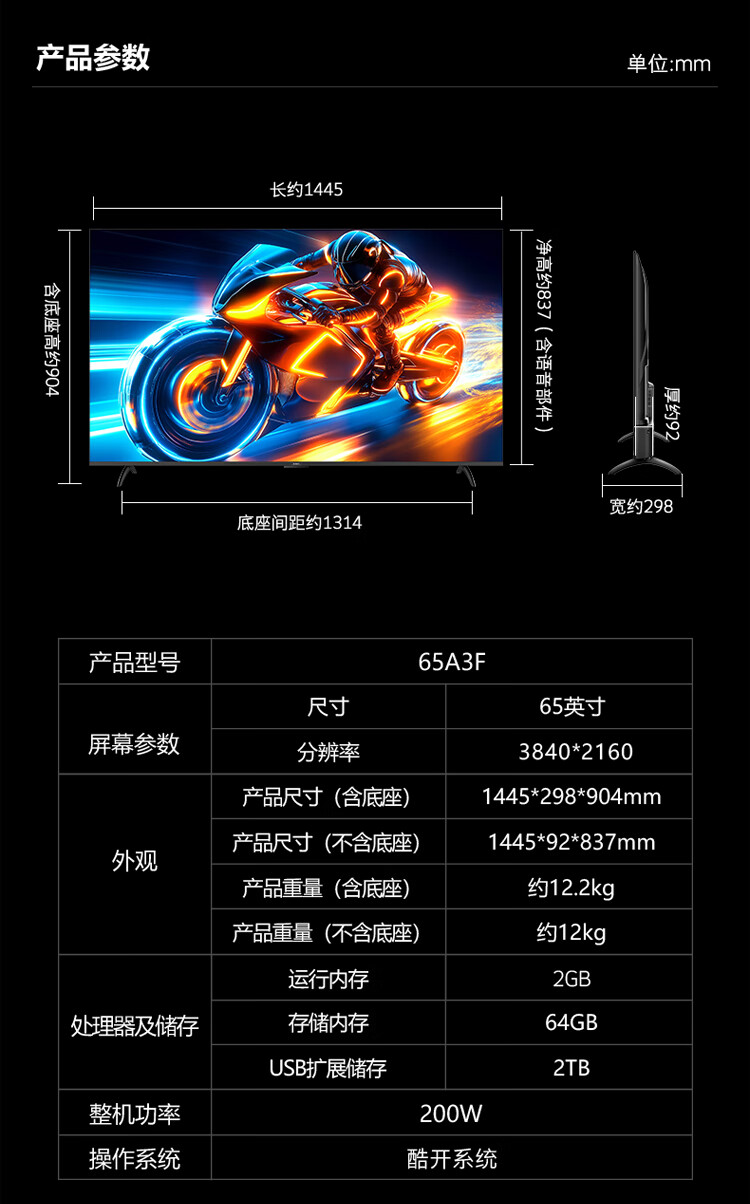 创维电视65英寸65A3F电视机144Hz超高刷 4K液晶游戏智能平板家电电视 65英寸 65英寸 【一级能效】