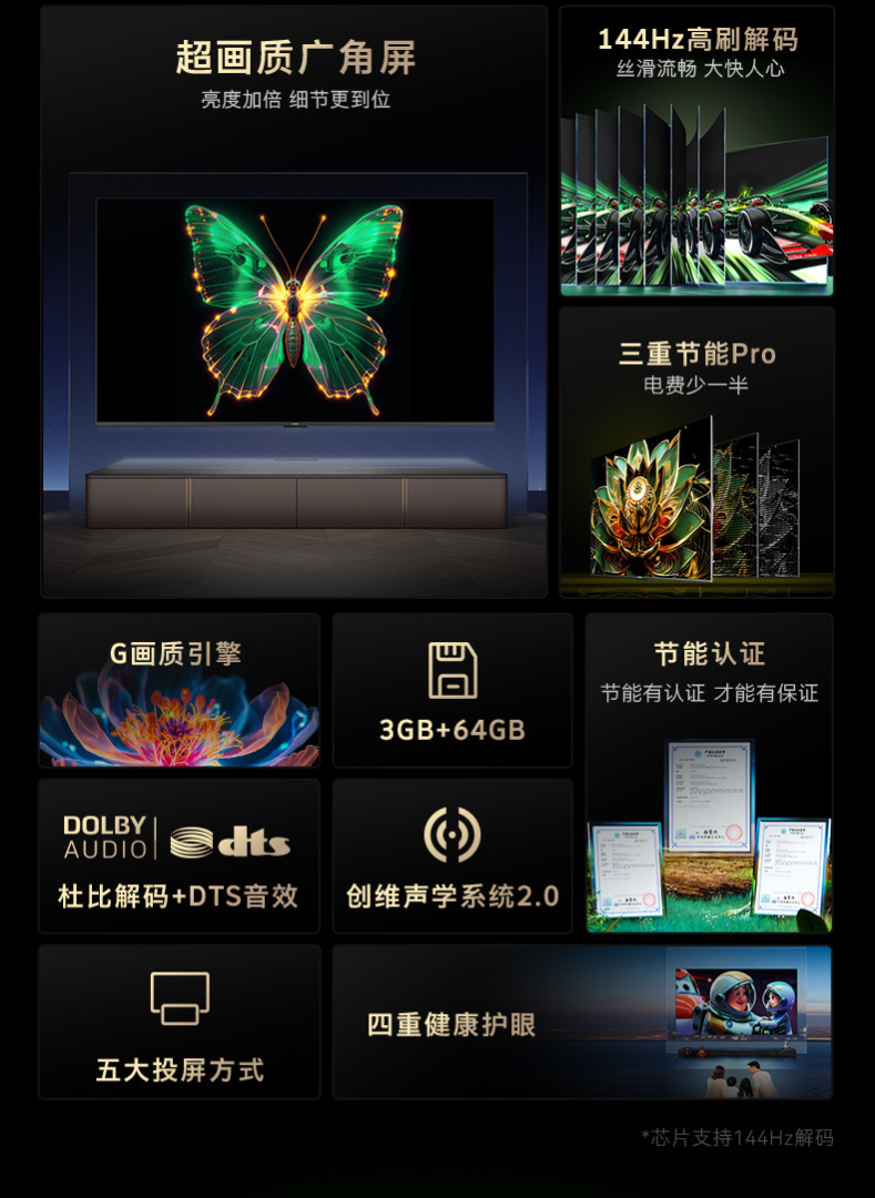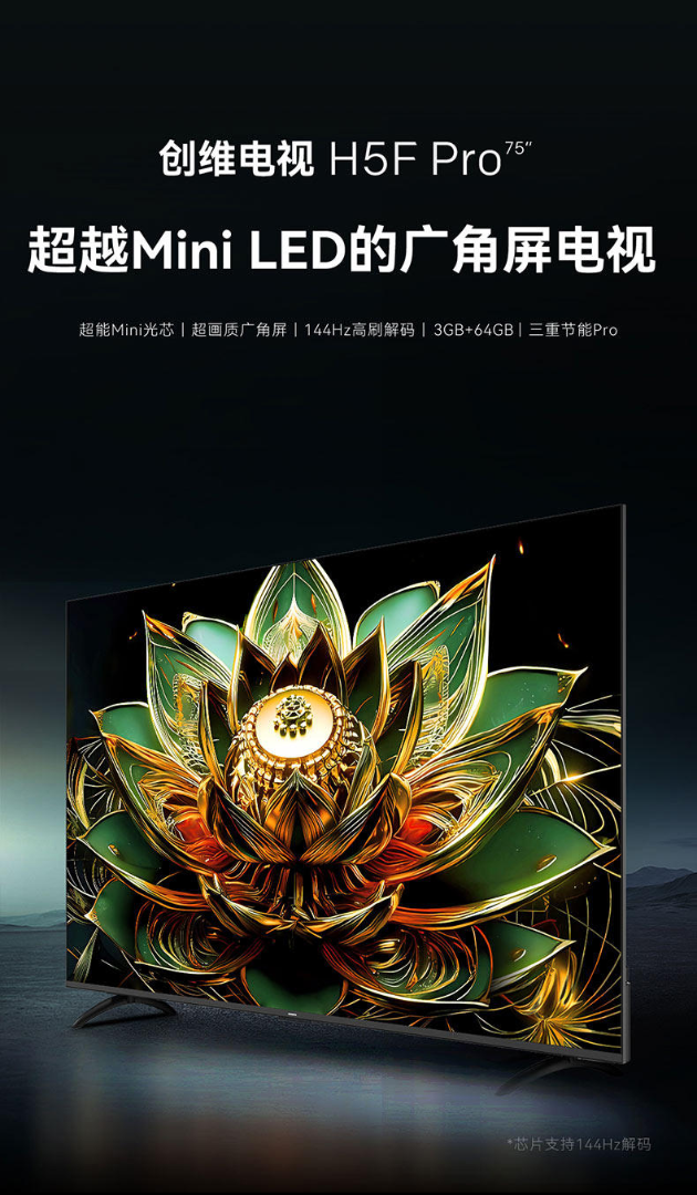 创维大内存高亮广角屏75H5F Pro 超能Mini光芯 144Hz高刷 3+64G