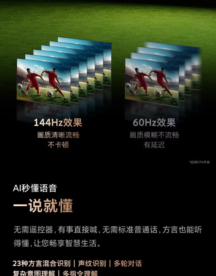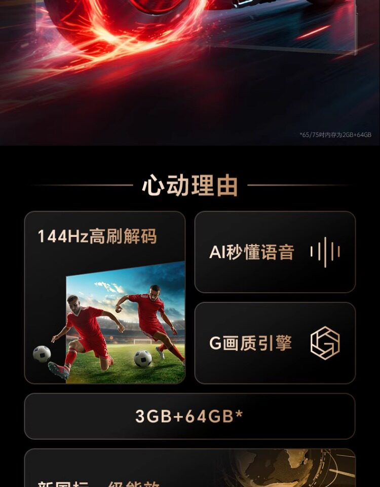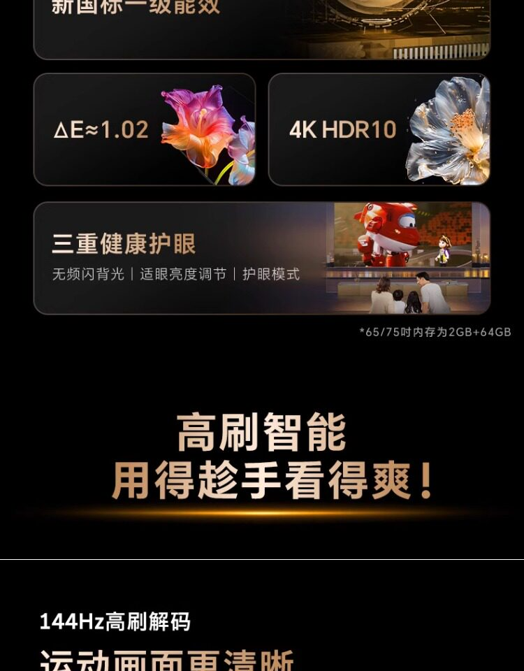 创维65V68F 144Hz高刷解码 一级能效 AI秒懂语音 2+64GB