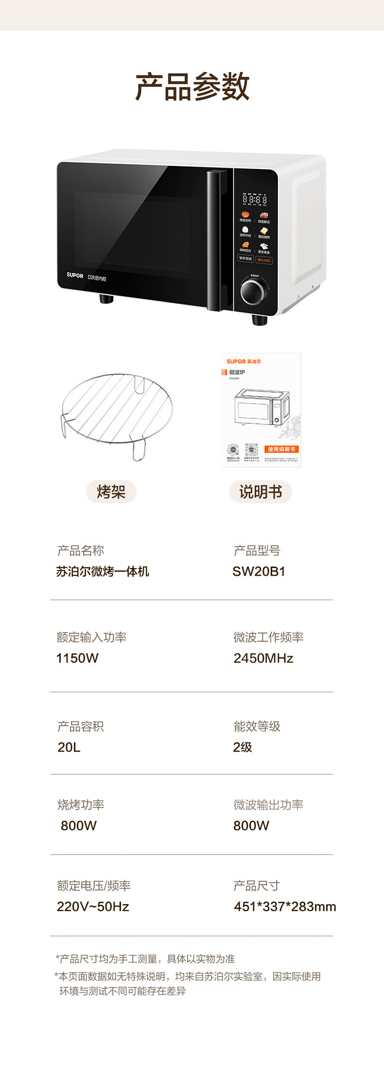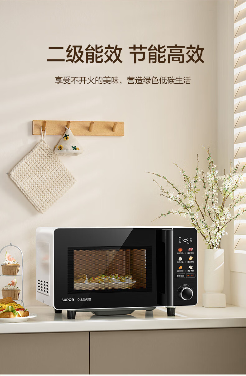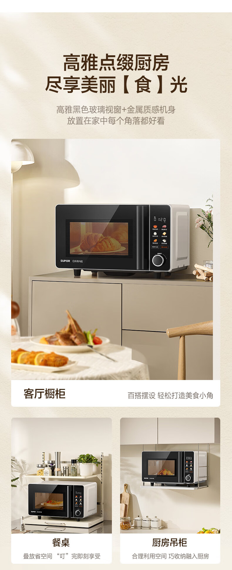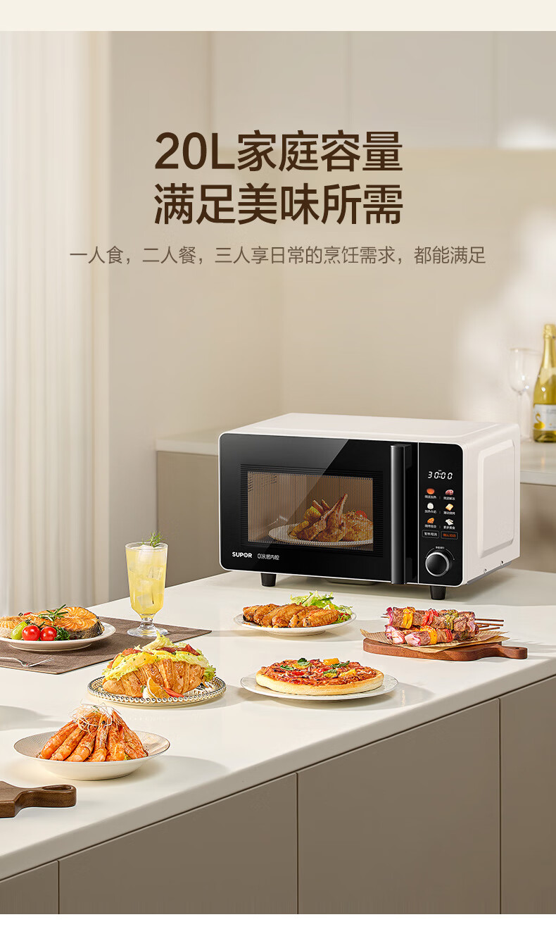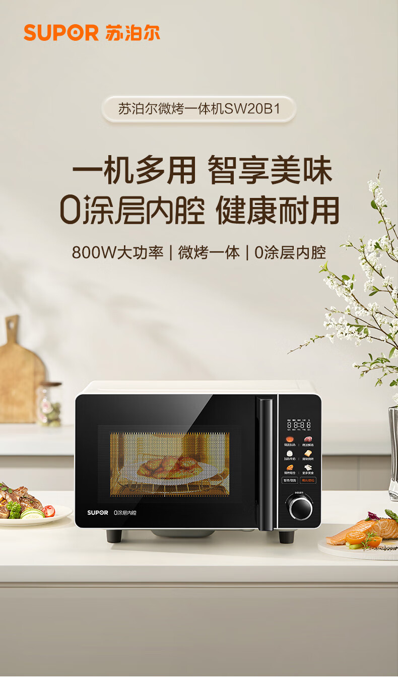 苏泊尔(SUPOR)微波炉烤箱一体机 0涂层不锈钢 家用20升平板加热智能杀菌解冻光波烧烤彩屏SW20B1商超同款