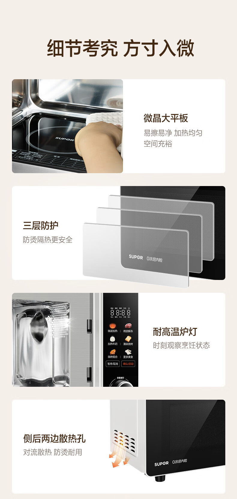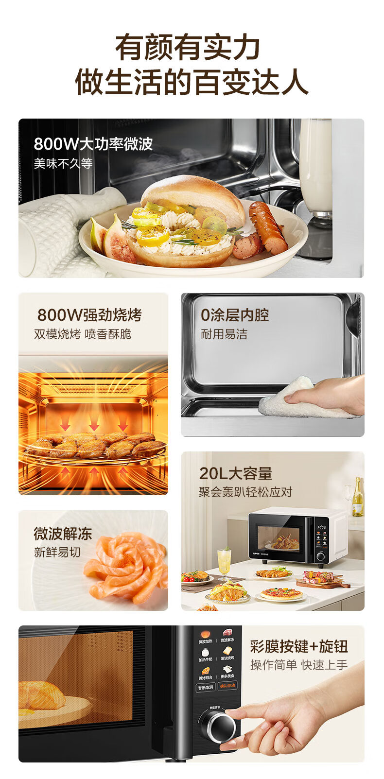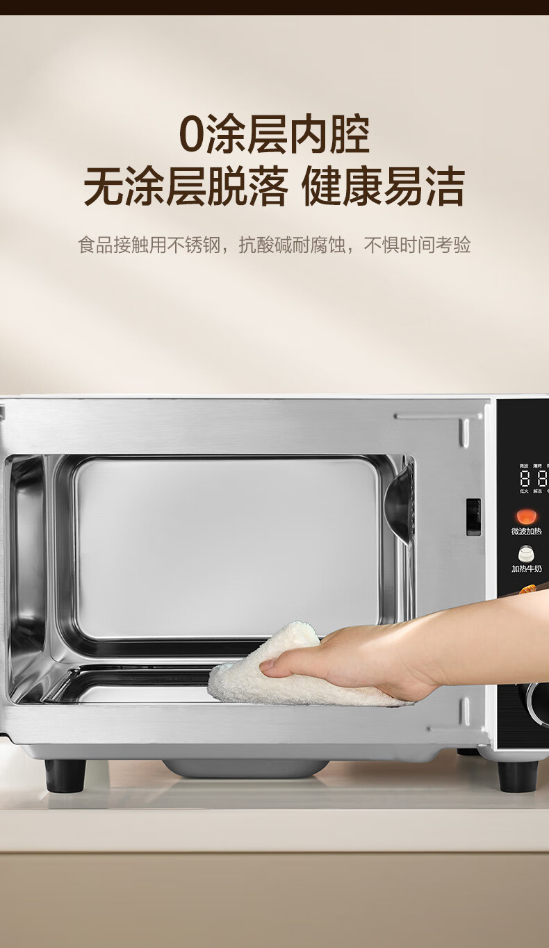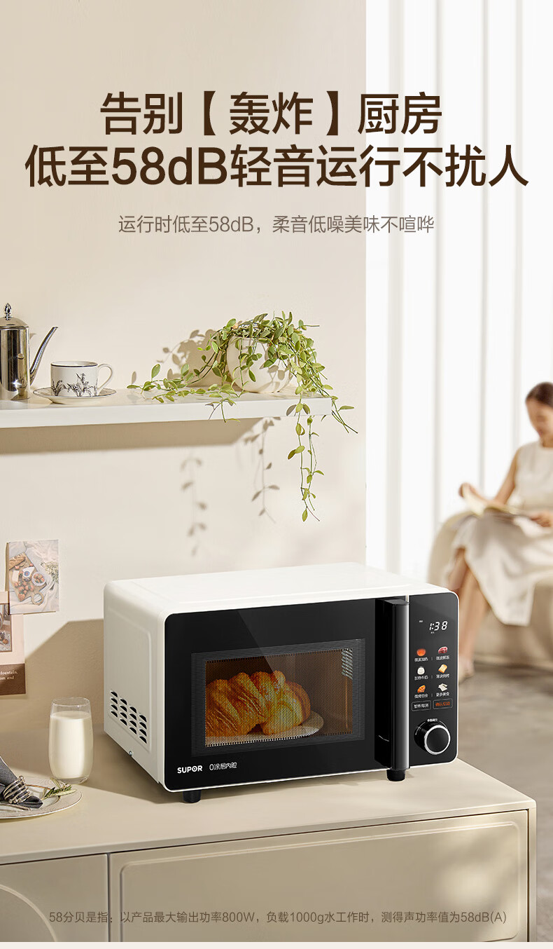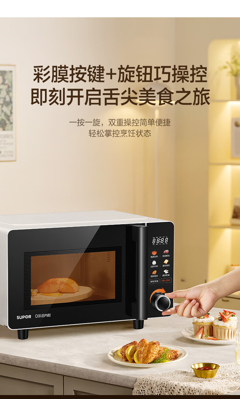 苏泊尔(SUPOR)微波炉烤箱一体机 0涂层不锈钢 家用20升平板加热智能杀菌解冻光波烧烤彩屏SW20B1商超同款