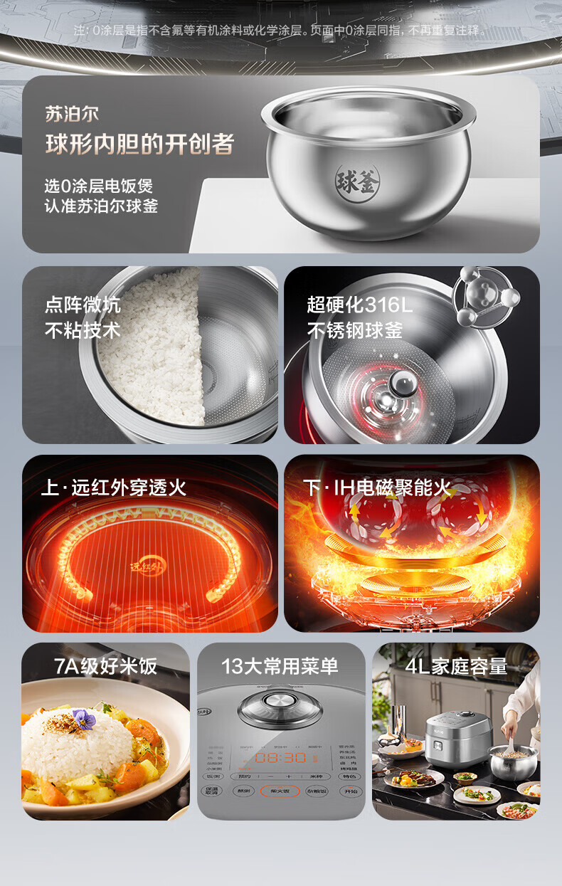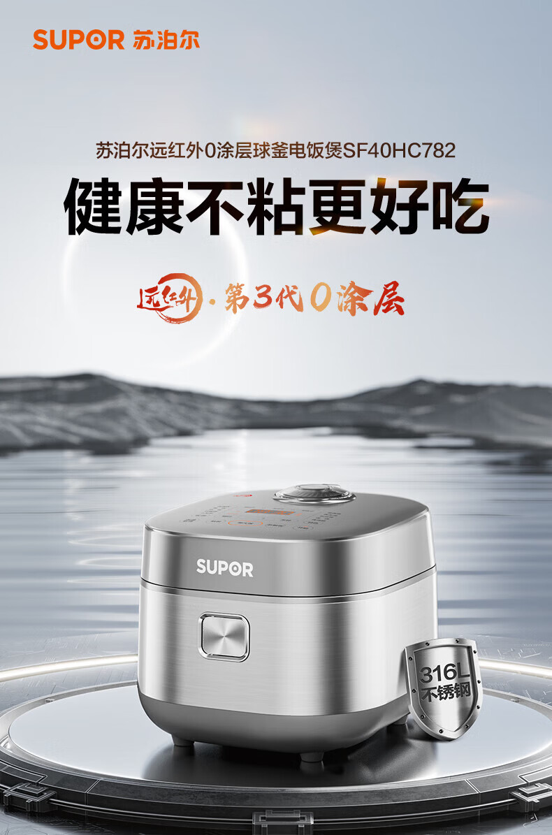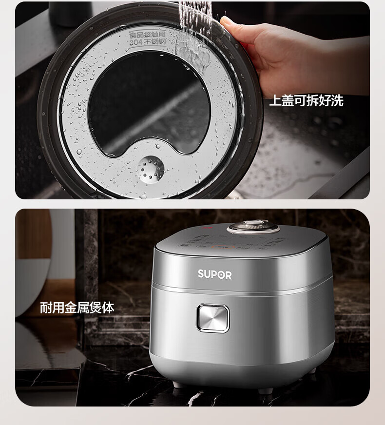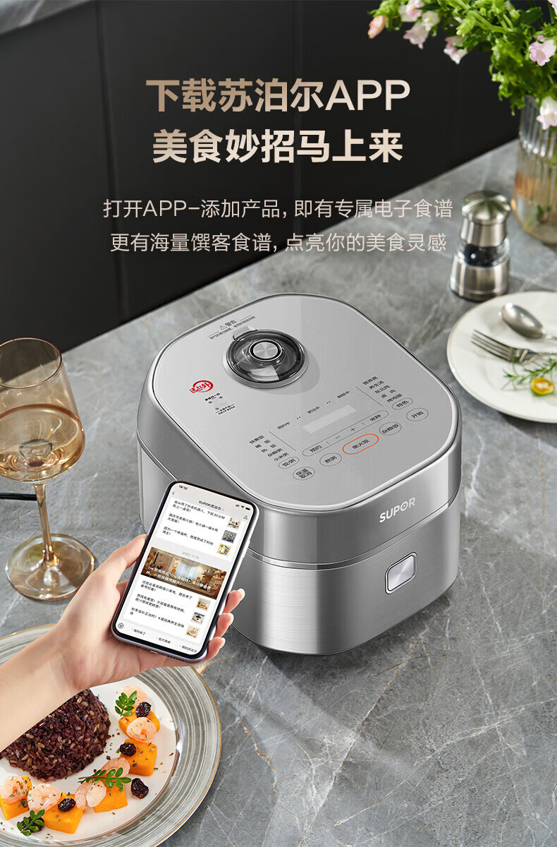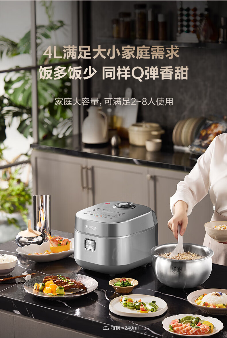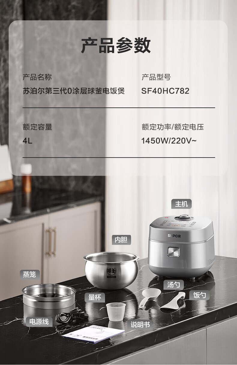 苏泊尔(SUPOR)0涂层4升3-8人 无涂层电饭锅不粘内胆1300W IH电磁加热 不锈钢内胆 智能预约电饭煲家用多功能 4L SF40HC782