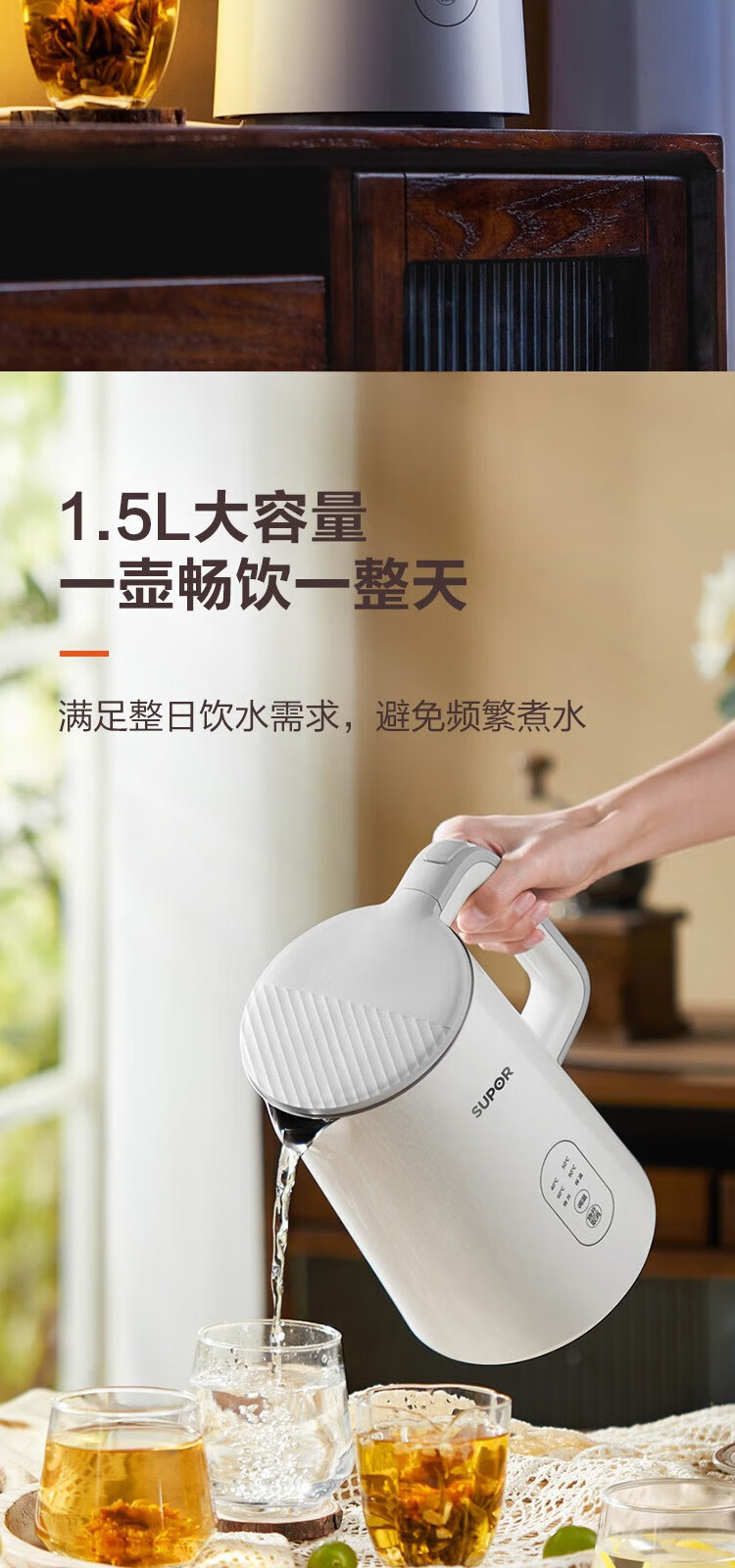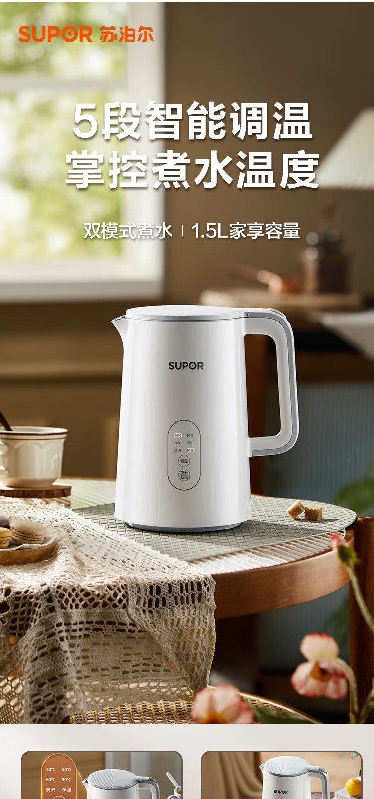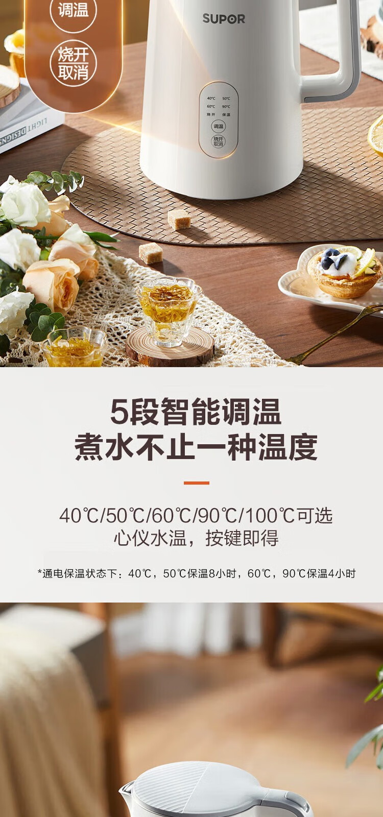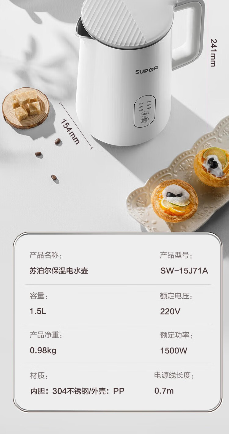苏泊尔(SUPOR) 电热水壶0胶水1.5L烧水壶5段调温恒温保温电水壶304不锈钢内胆SW-15J71A 1.5L