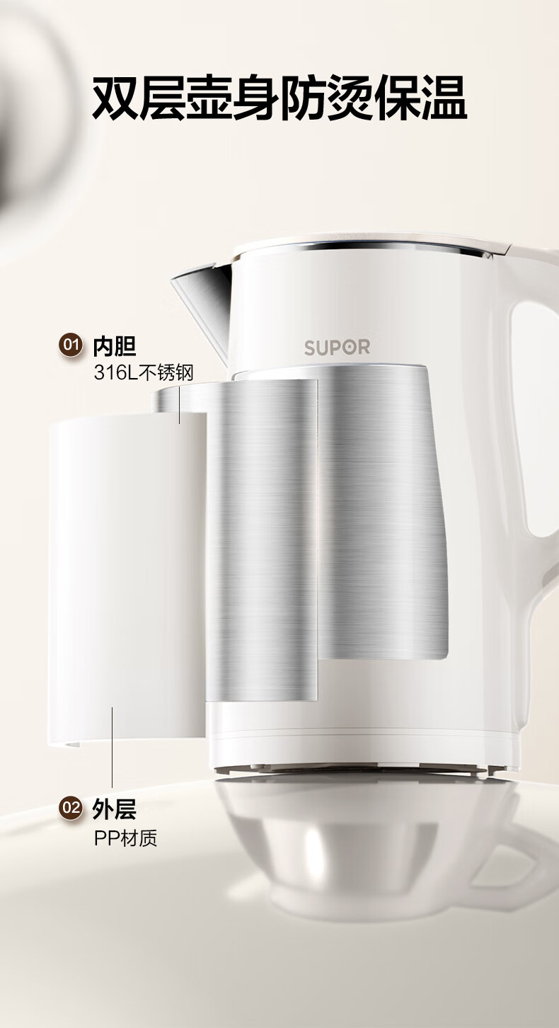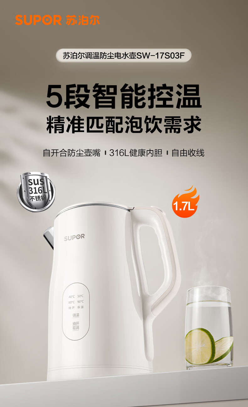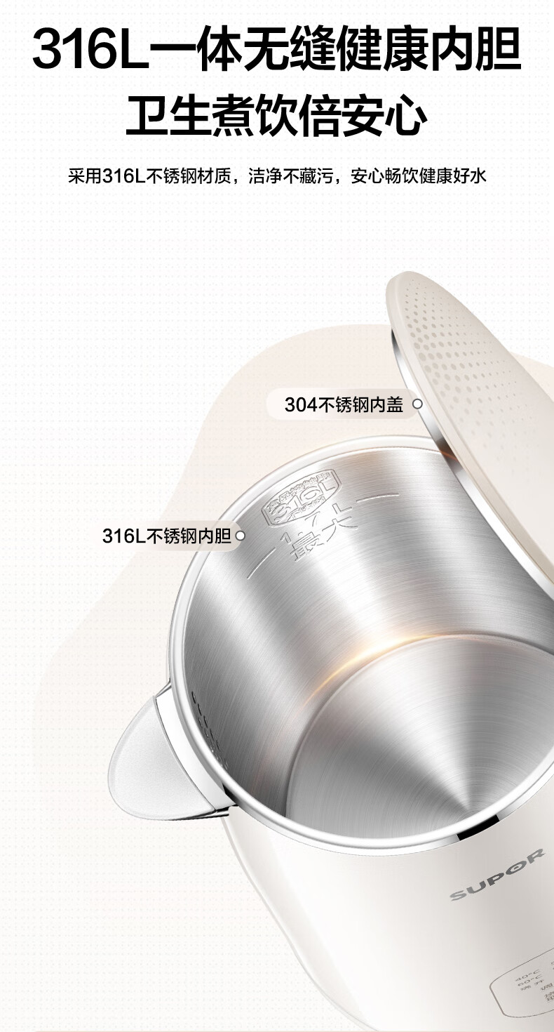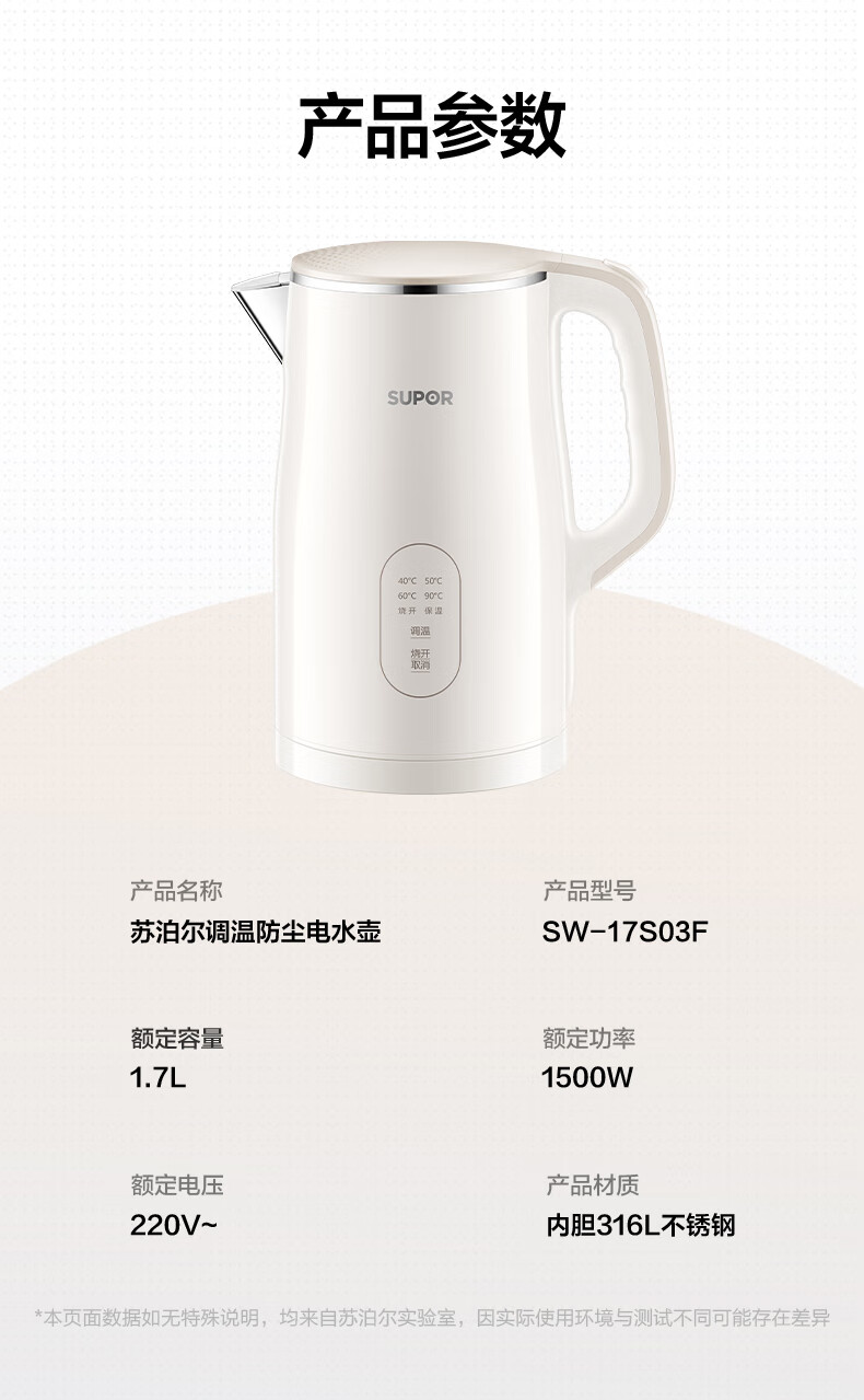 苏泊尔电热水壶家用无缝内胆大容量精准控温自动断电双层防烫低音烧水壶 1.7L 【316L不锈钢】SW-17S03F