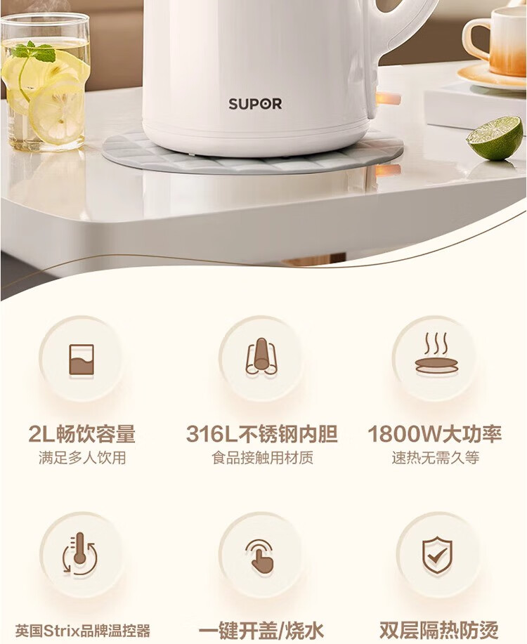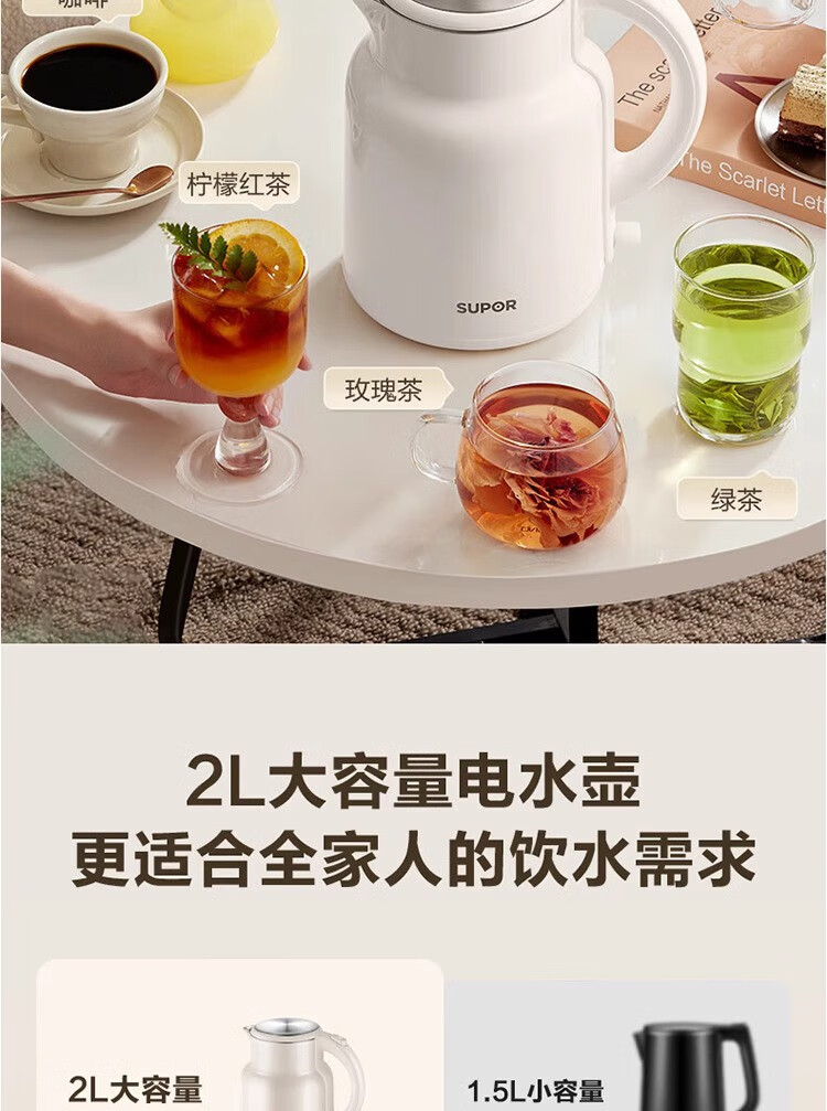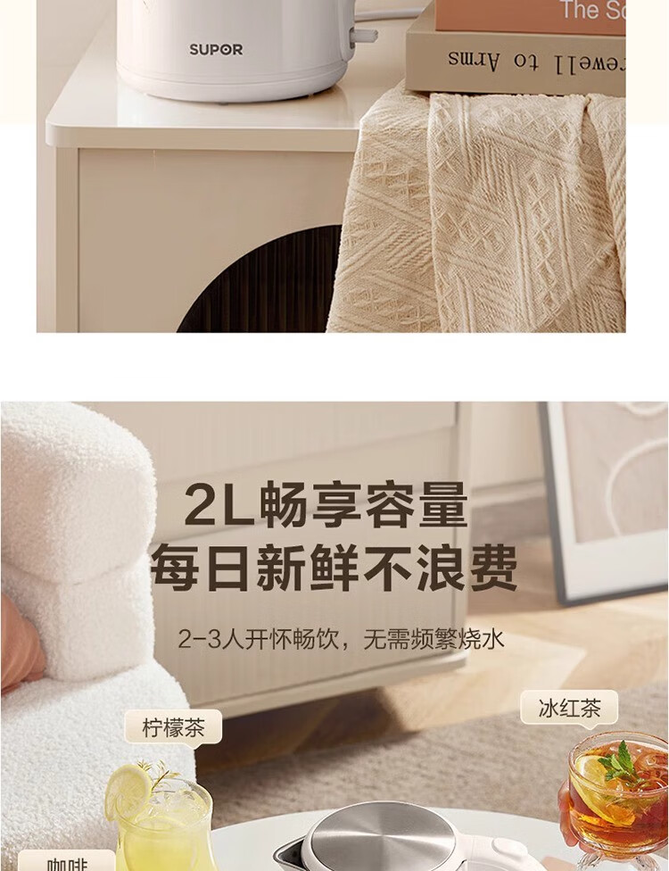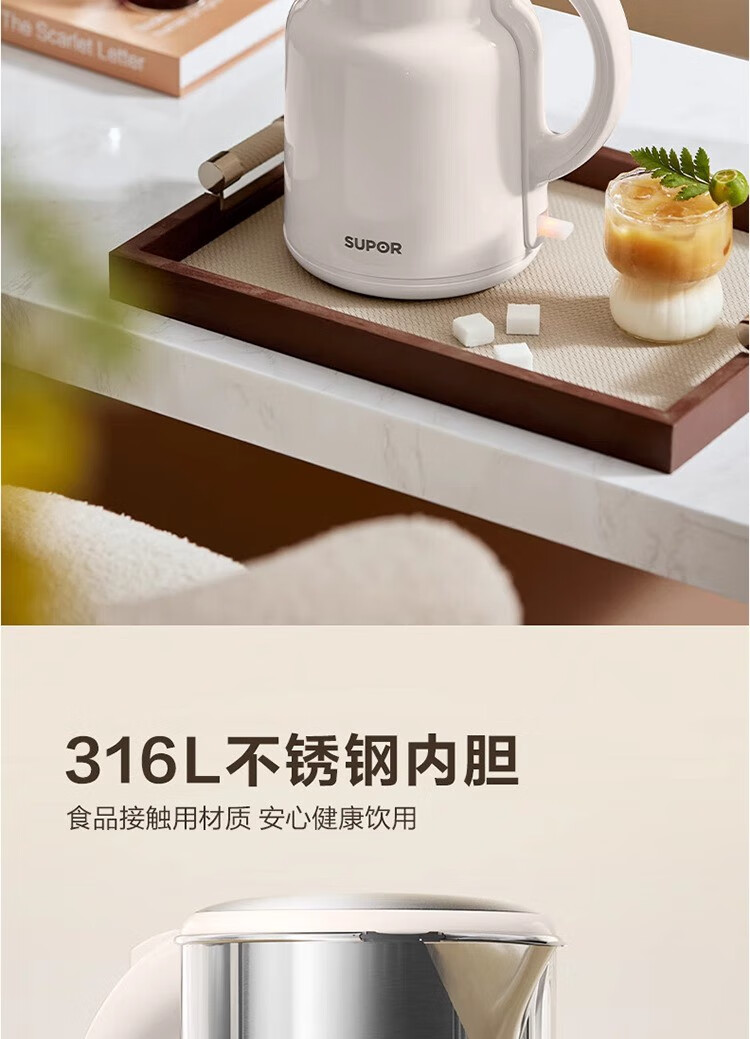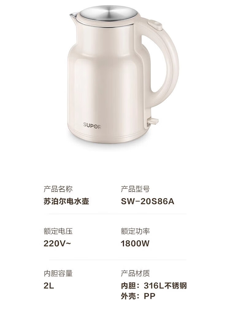 苏泊尔苏泊尔20S86A电热水壶家用316L不锈钢大容量电烧水壶保温电热壶 米白色 2l 2L 2l