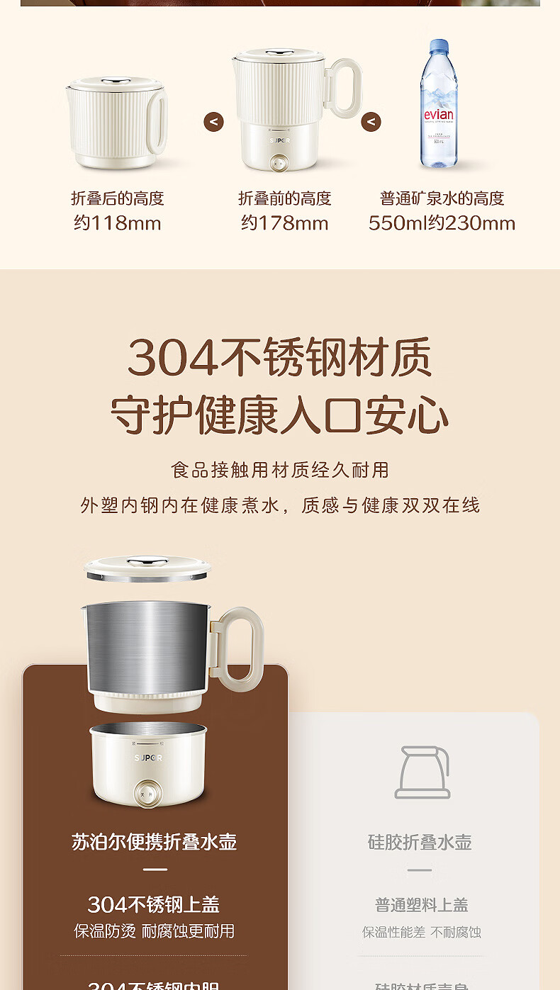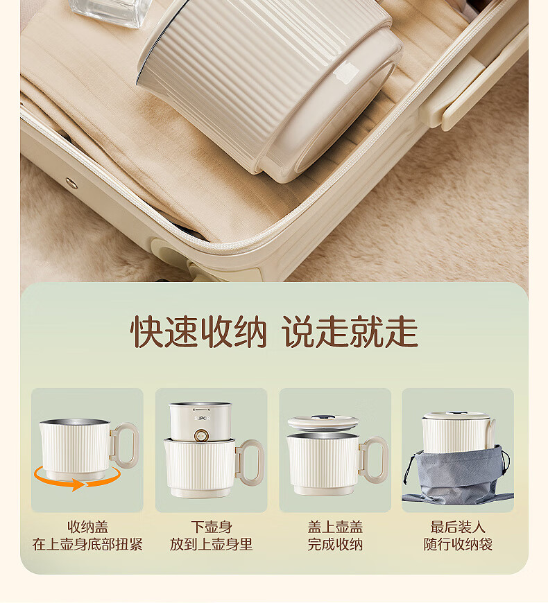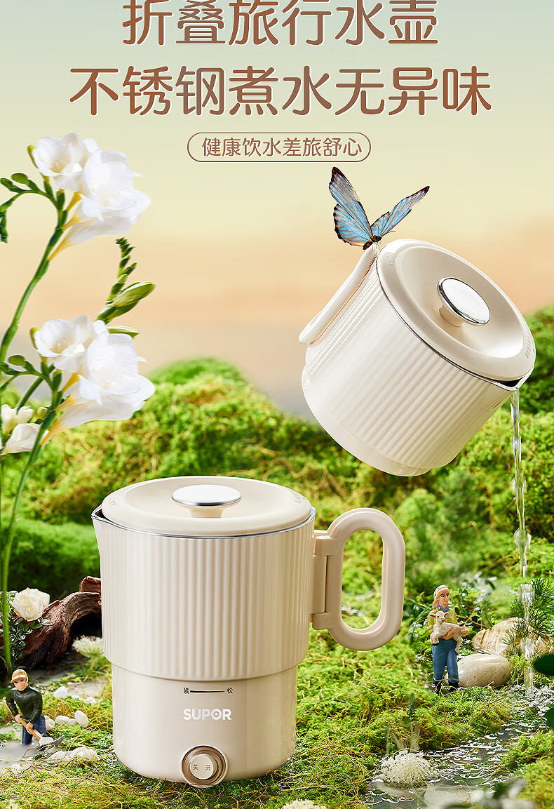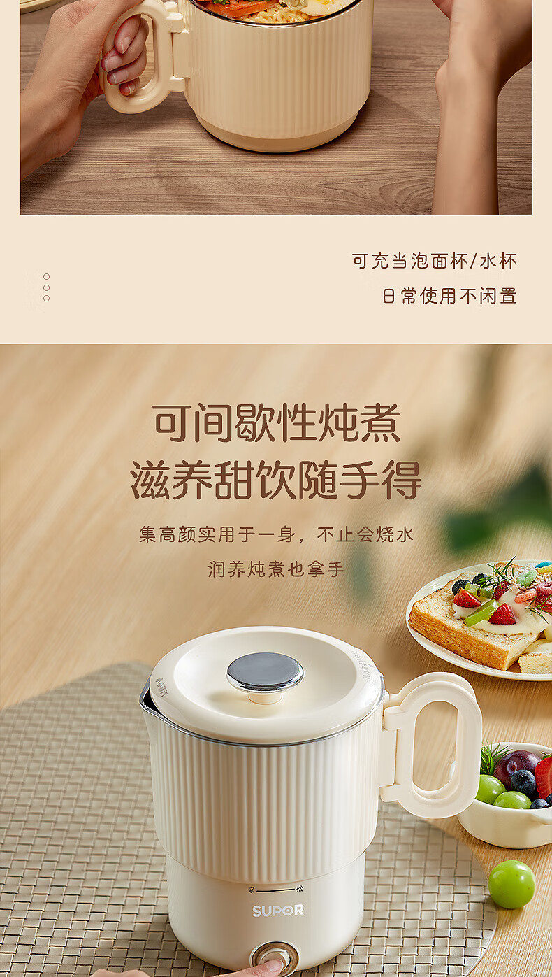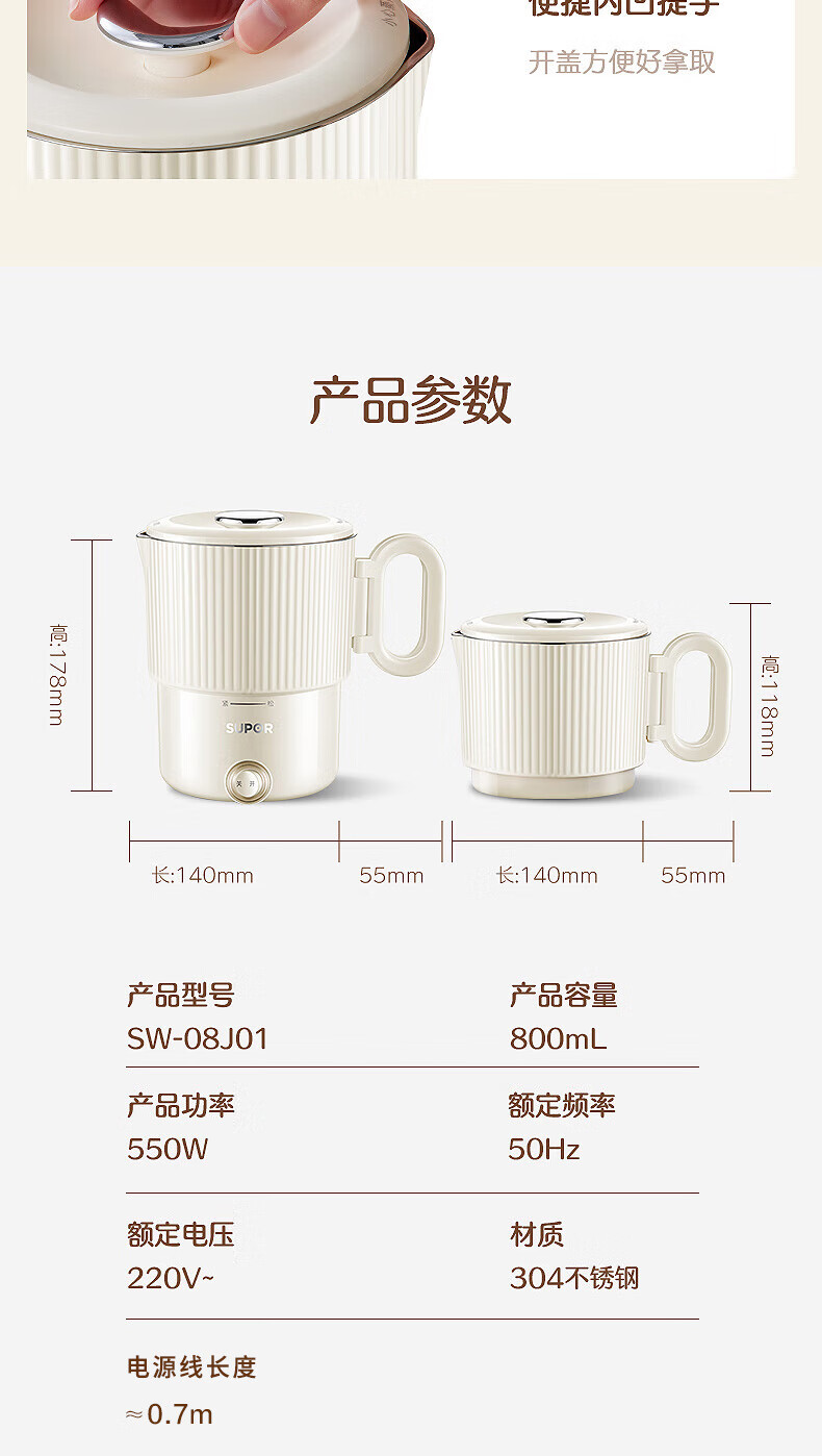 苏泊尔(SUPOR)便携式烧水壶电水壶可折叠0.8L 旅行出差家用养生冲奶电热水壶学生304不锈钢泡面杯 SW-08J01