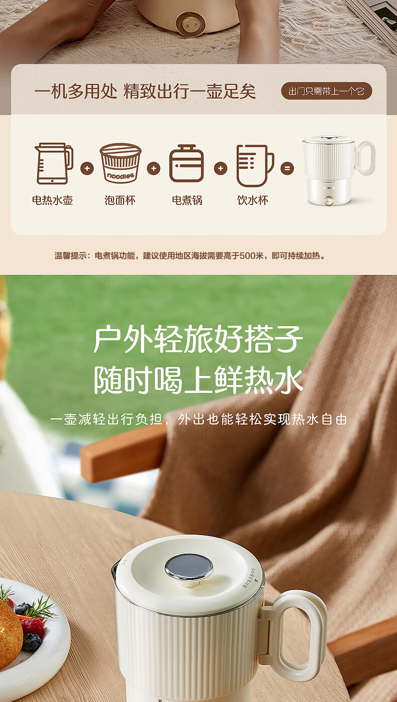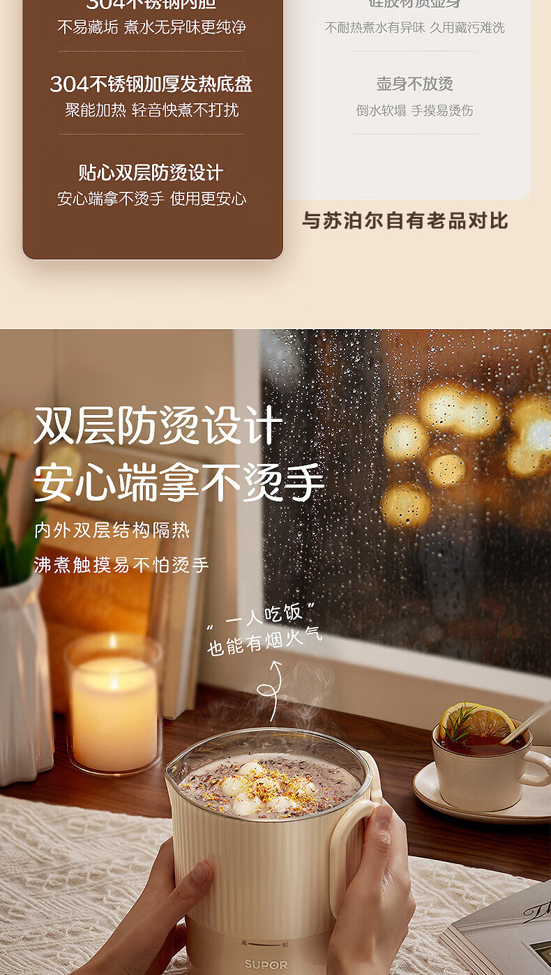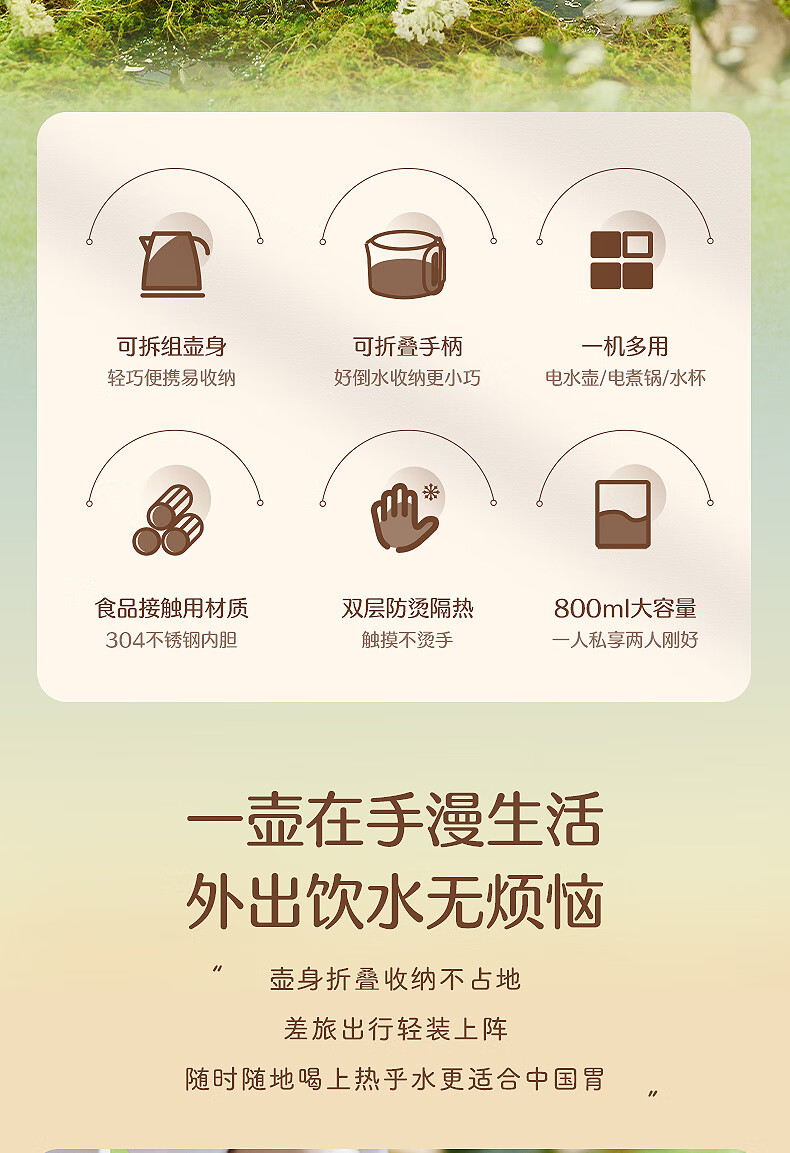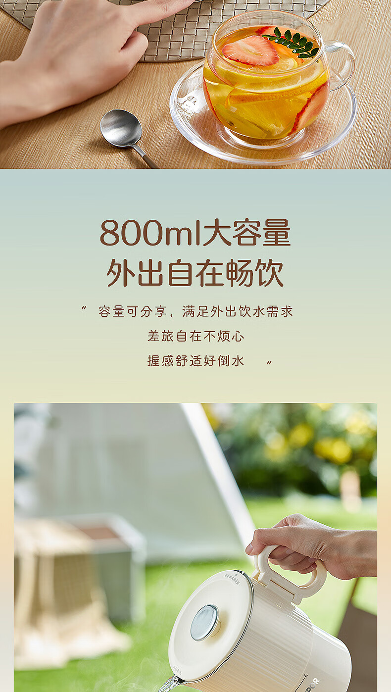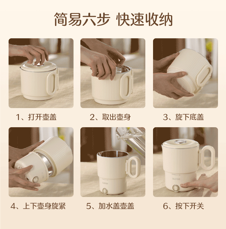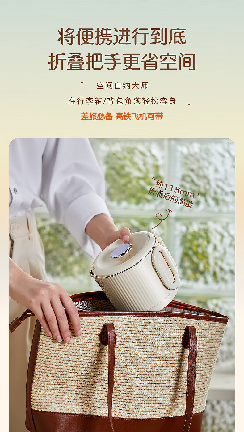 苏泊尔(SUPOR)便携式烧水壶电水壶可折叠0.8L 旅行出差家用养生冲奶电热水壶学生304不锈钢泡面杯 SW-08J01