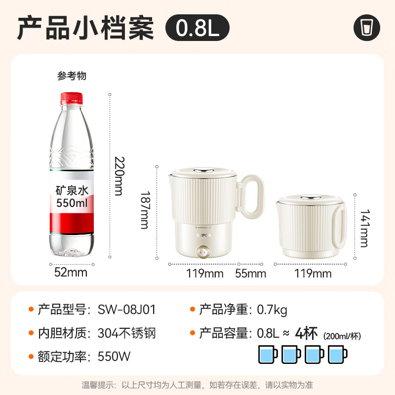 苏泊尔(SUPOR)便携式烧水壶电水壶可折叠0.8L 旅行出差家用养生冲奶电热水壶学生304不锈钢泡面杯 SW-08J01..